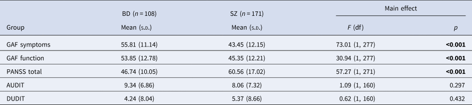 ASP was prevalent in 14.3% of our sample (Table 1). More patients with BD experienced ASP, compared to the SZ group, but the prevalence of ASP did not significantly differ between patient groups and HC. There was a larger proportion of females in the BD group compared to the other groups. HC were older and had more years of education than the patient groups. The SZ group acquired less education than the BD group. A greater degree of clinical symptoms and reduced general functioning was found in the SZ group using GAF and PANSS scores compared to the BD group (Table 2). There were no differences in AUDIT (Alcohol Use Disorders Identification Test) and DUDIT (Drug Use Disorders Identification Test) scores between patient groups.