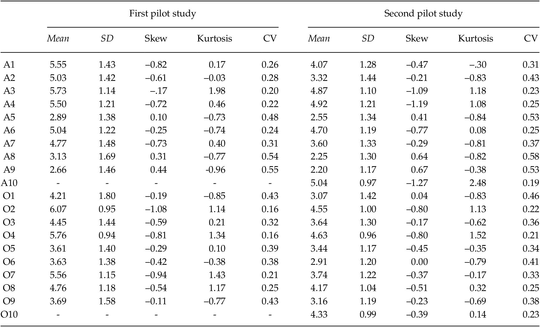 First Pilot Study. Table 1 shows the descriptive indices of all items of the adapted version (see response frequency distributions in the Supplementary Materials 9 and 10). In self-interest, the means of the items was around five, except for A5, A8 and A9 whose means were around three. In other-interest, the means were all above four, except for O5, O6 and O9). Regarding the frequency distributions, the percentage of responses indicated in alternative 4 (intermediate) exceeded 20% in three items of the self-interest dimension (A5, A7 and A8) and in six of the other-interest dimension (O1, O3, O5, O6, O8 and O9), in several of those rising up to 50%. This may happen in the original test (Gerbasi & Prentice, Reference Gerbasi and Prentice2013), since they obtained means around four in several samples. Not in vain, according to Hernández et al. (Reference Hernández, Drasgow and González-Romá2004), the middle category in rating scales should be avoided, since the assumption that all respondents use the ordered-response categories in the same way cannot be maintained.