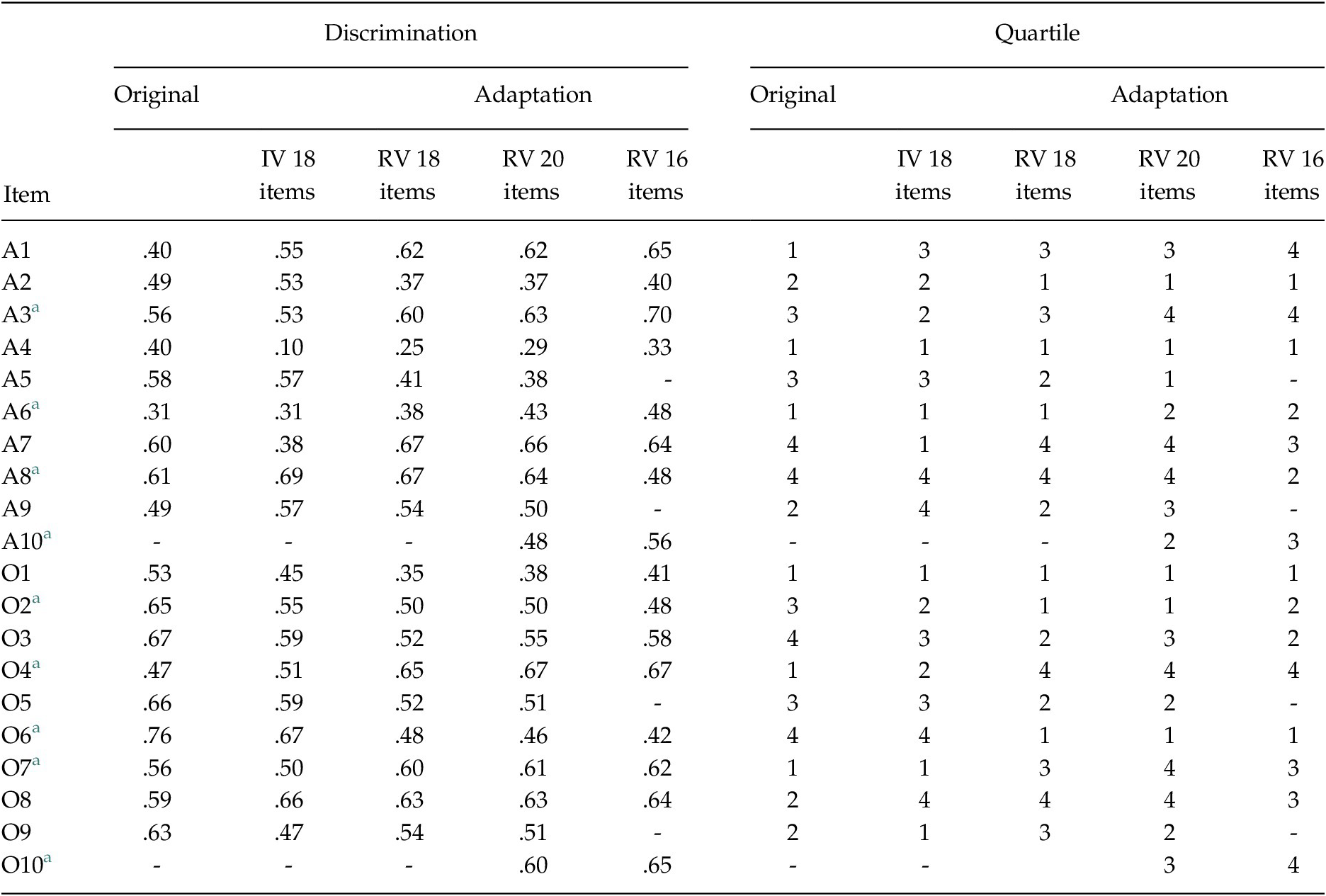 These modifications mitigated the psychometric problems of the items. The variability of the items was higher than in the first study, and all the items, with the exception of A4 in the 18-items and 20-item versions, showed good discrimination coefficients. Not in vain, A4 presented the second lowest discrimination coefficient in the original test. The distribution of discrimination indices of the items, before the modifications, tended to be similar to the original. Furthermore, the discrimination indices were not statistically different between the original and the adaptation in all items. These results suggest that the items have a similar discriminative capacity in both contexts.