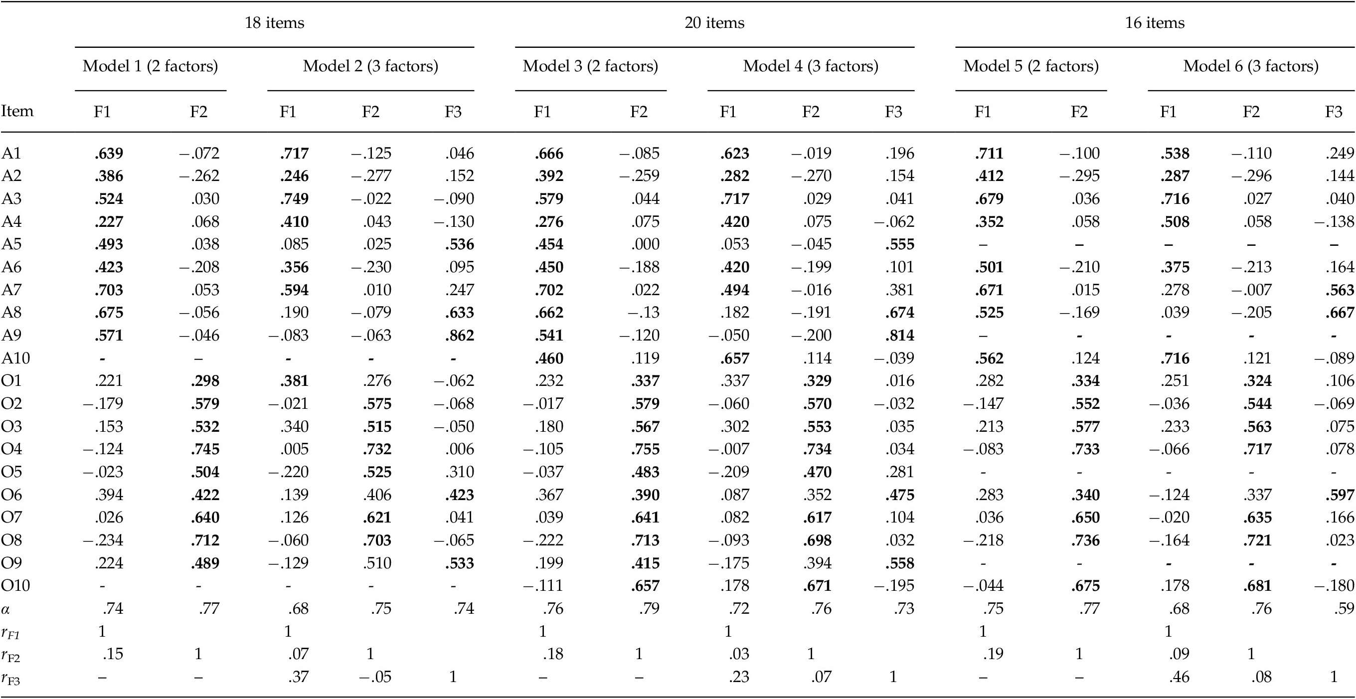 The reliability indices were suitable in all models, except for some factors in the three-factor solutions. Considering the internal structure, the EFA showed again that the solution of three factors presented better results than the two factors. However, the distribution of factor loadings in the two-factor model and the fit indices were acceptable. For this reason and because the items with the highest standardized residuals were those related to the third factor (A5–O5, A9–O9), it was decided to check another model without these items. The new EFA with the 16-items version showed that the two-factor model fits the data adequately and the factor loadings are distributed according to the theoretical model. The three-factor model fitted well with the data, but the factor loadings of the items were not distributed according to any theoretically interpretable cluster. In terms of reliability, adequate coefficients were obtained in the two-factor model, but in two factors of the three-factor model, it was below the recommended value (Nunnally & Berstein, Reference Nunnally and Bernstein1995).