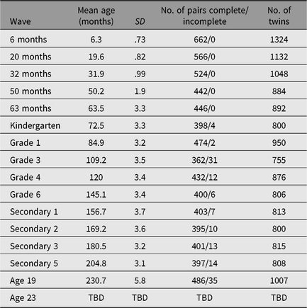 This article is a revised and updated edition of a previous description of the Quebec Newborn Twin Study (QNTS; Boivin, Brendgen, Dionne et al., Reference Boivin, Brendgen, Dionne, Dubois, Pérusse, Robaey and Vitaro2013). As the name entails, the QNTS is an ongoing prospective longitudinal follow-up of a birth cohort of twins born between 1995 and 1998 in the greater Montreal area. The goal of QNTS is to document individual differences in the cognitive, behavioral, social-emotional aspects of developmental health across childhood, their early genetic and environmental determinants, as well as their putative role in later social-emotional adjustment, school and health outcomes. A population-based sample of >660 families of twins were initially enrolled in QNTS, and then assessed longitudinally at regular intervals. The QNTS is part of a larger research initiative that also involves the Québec Longitudinal Study of Child Development (QLSCD), an ongoing longitudinal follow-up of a representative sample of >2000 children born as singletons in 1998 in the province of Québec, Canada. The QNTS and the QLSCD are companion studies sharing many features (measures and time of assessments), including an extensive and detailed set of evaluations in the early years, thus providing together a unique window into the role of early childhood in development.