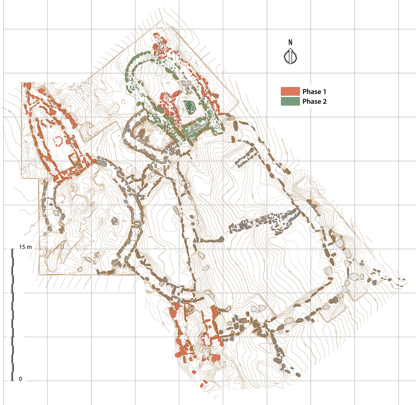 CBII is an open-air village (Figure 1) of nine structures, three of which are naviforms (Figure 2). These are boat-shaped house structures built using a cyclopean masonry technique (e.g. Salvà & Hernández-Gasch Reference Salvà, Hernández-Gasch and Belarte2009), typical of domestic structures in the wider Balearic Bronze Age. Two different phases of construction have been identified at the site, and new radiocarbon dating attributes these to 1580–1531 cal BC (phase 1) and 997–927 cal BC (phase 2) (Sureda et al. Reference Sureda, Camarós, Cueto, Teira, Aceituno, Albero, Álvarez-Fernández, Bofill, López-Dóriga, Marín, Masclans, Picornell, Revelles and Burjachs2017a). Abandonment of the village was probably related to the Phoenician colonisation of the island after the ninth century cal BC.