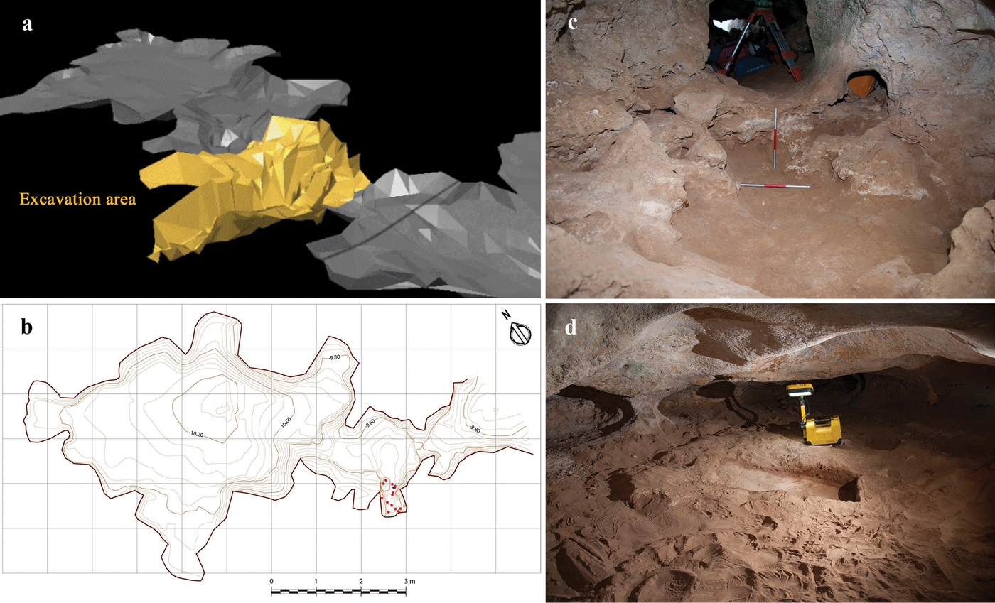 Figure 5. Cave 127: a) excavation area; b) cave plan; c) corridor; d) funerary chamber.