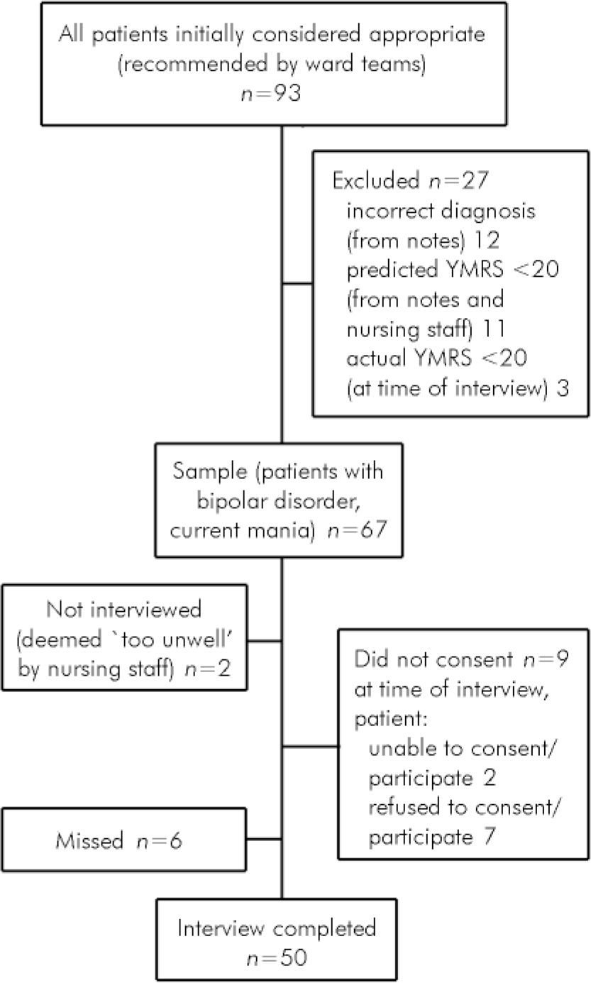 In-patients with an ICD-10 (World Health Organization, 1992) diagnosis of bipolar affective disorder, current episode manic with or without psychosis, were recruited from a psychiatric hospital. All in-patients aged 18-75 years with a possible diagnosis of mania from case notes were assessed for eligibility by one of two specialist registrars in psychiatry. The diagnosis was confirmed by reference to the case notes and following discussion with the clinical team. Patients with an unclear diagnosis, a diagnosis of schizoaffective disorder or those predicted to have a low Young Mania Rating Scale score (YMRS; Reference Young, Biggs and ZieglerYoung et al, 1978) were excluded. Patients were approached during the first few days of admission and those unable to give informed consent to enter the study were approached at a later date after clinical improvement.