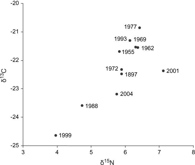 There was no observable pattern or trend in the stable isotope values through the years analysed (n = 22; Figure 3). The stable isotopes in feathers collected over the years showed values remarkably constant for δ13C (F 9,12, = 1.10, P = 0.45; Figure 4a) with the value for 1897 virtually identical to the recent measurements. However, the δ15N signature values showed significant temporal differences (F 9, 12 = 4.52, P < 0.01; Figure 4b).