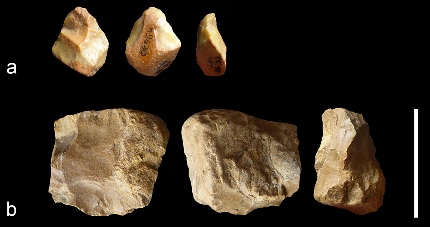 Figure 9. (color online) Campogrande area, CG10 locality (cores). (a) Unit CG10A, inventory no. M7552, small core on a flint pebble, where the debitage is on two orthogonal faces; (b) unit CG10A, inventory no. M7868, cores on flint pebbles with one or orthogonal flaking surfaces. Scale bar is 50 mm.
