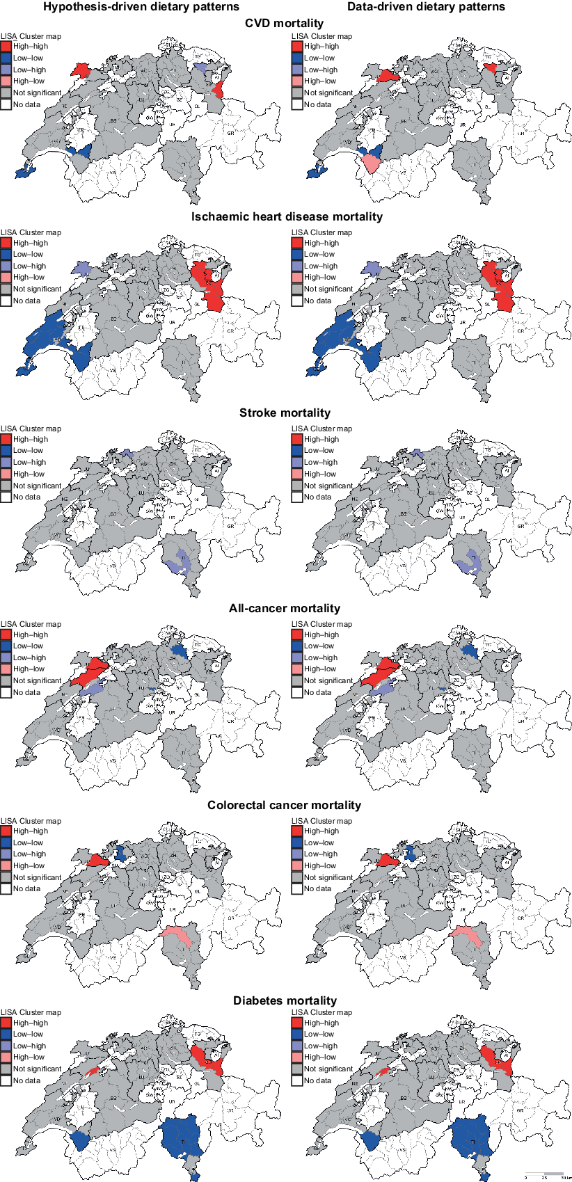 In the present study, both hypothesis- and data-driven dietary patterns were significantly associated with chronic disease mortality. High AHEI was associated with lower district-level SMR for the chronic diseases of interest, whereas the Swiss traditional and Western-like patterns were associated with higher district-level SMR for CVD, IHD, stroke and diabetes. For both hypothesis- and data-driven dietary patterns, no significant associations were observed for all-cancer mortality. Additionally, Moran’s I statistics on regression residuals revealed significant global and local spatial dependence in the investigated associations.
