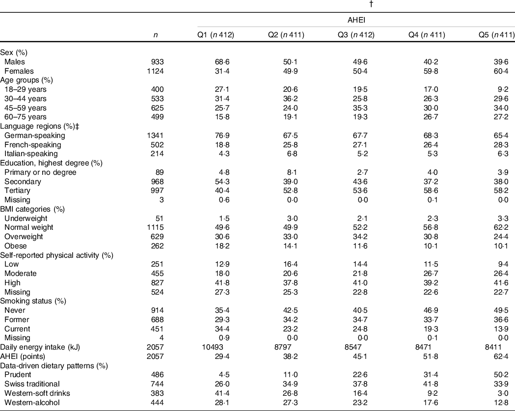 Table 1 Characteristics of the menuCH participants by AHEI quintiles (n 2057) (Numbers and percentages)*,†