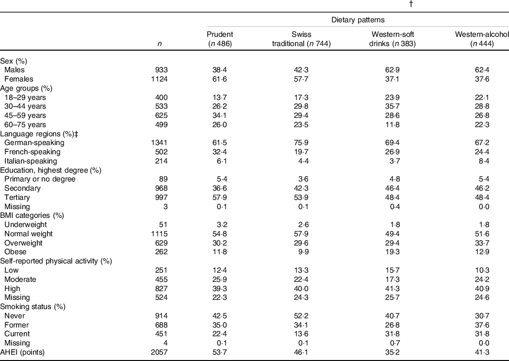 † Results are weighted for sex, age, marital status, major regions of Switzerland (NUTS-2), nationality, household size; results for daily energy intake, AHEI and data-driven dietary patterns are further weighted for season and weekday; weighting factors were applied according to the menuCH weighting strategy(Reference Pasquier, Chatelan and Bochud33); n are unweighted.