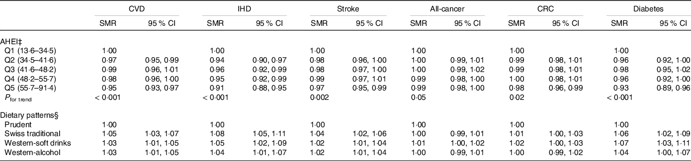 IHD, ischaemic heart disease; CRC, colorectal cancer; SMR, standardised mortality ratio; AHEI, Alternate Healthy Eating Index; Q, quintile.