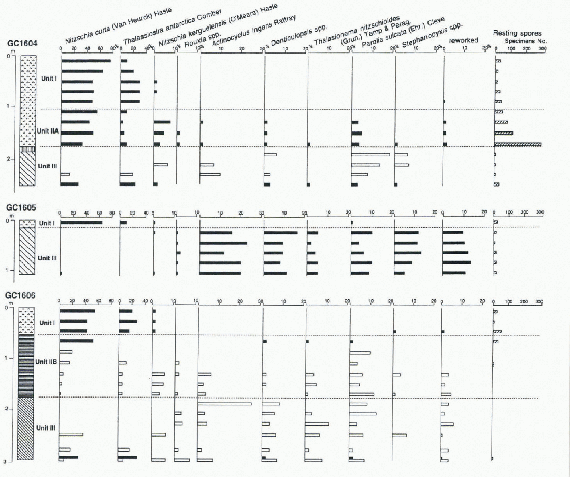 The assemblages of unit IIA are similar to those of unit I, with the presence of Nitzschia kerguerensis and Paralia sulcata. though the diatom contents are smaller than those in unit I. Resting spores are abundant in the lower part of this unit.
