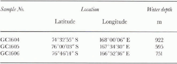 The sediment core samples used in this study were collected from the western margin of the Ross Sea (Fig. 1; Table 1) during theTH95 Antarctic Cruise in 1996 conducted by the Technology Research Center, JNOC, using R/V Hakurei-Maru. A gravity corer with an 11 cm diameter and 5.4 m long was used, but the recovered core lengths were shorter because of the presence of hard substrata in the shallower