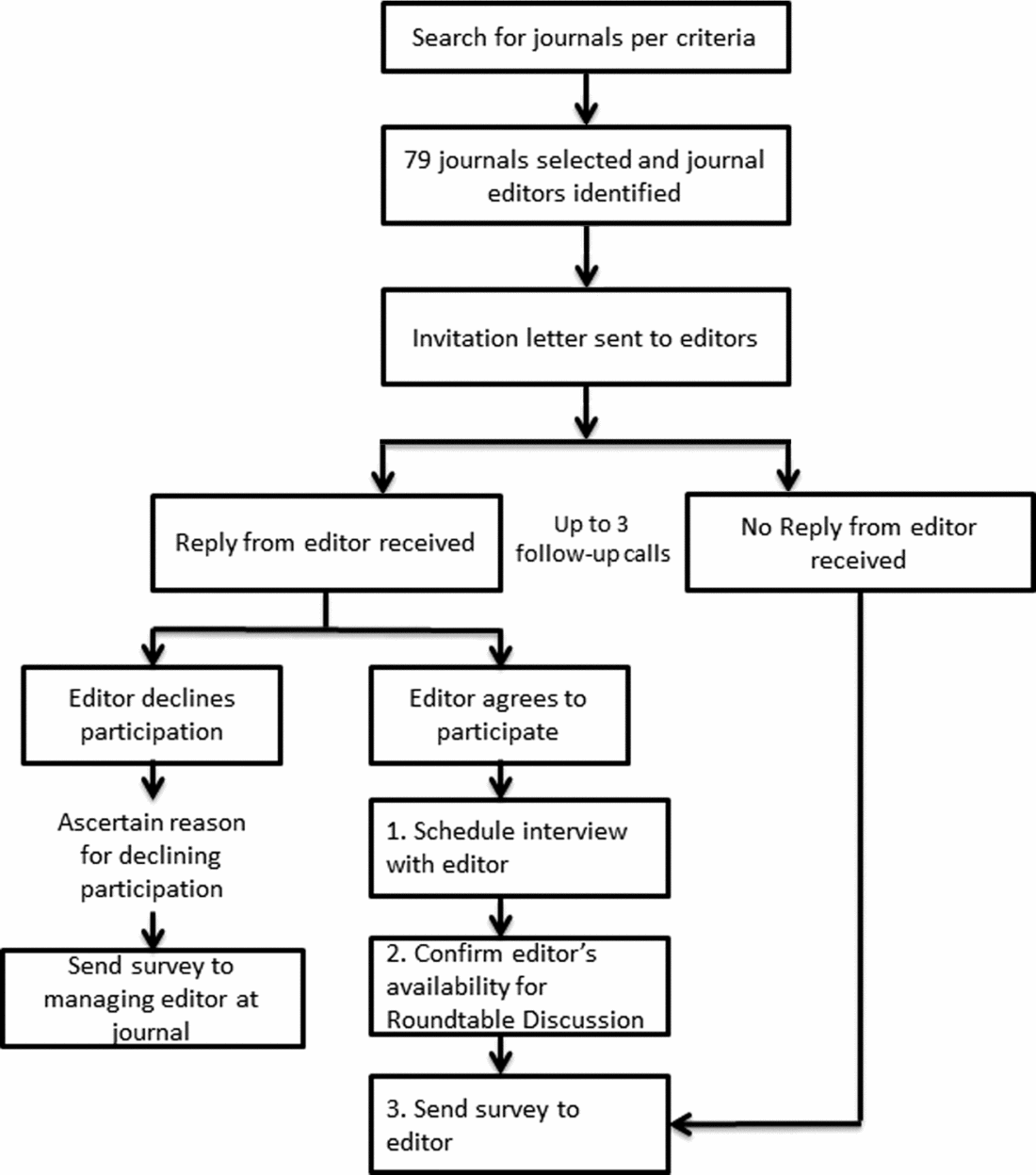 A mixed methods approach was used to gather peer-reviewed journal editors’ perceptions by means of telephone interview, survey, and in-person roundtable (RT) discussion. The protocol for this study was given exempt status by the University of Maryland, Baltimore Institutional Review Board.