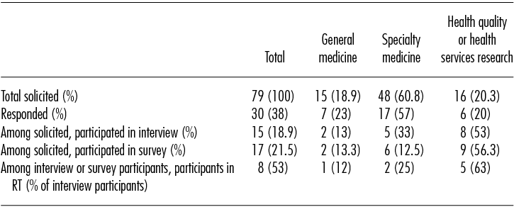 Journals were selected and sampled from three topic areas: general medicine (GM), specialty medicine (SM), and health policy/services research (HSR) to provide a broad representation of relevant journal content and readership audiences. Journals were identified using Reuters InCites, and inclusion and exclusion criteria were informed by prior studies (Reference Wager, Williams and Project15–Reference Hing, Higgs, Hooper, Donell and Song17). Journals were eligible if: indexed in Medline; had an impact factor ≥2; and were published in the English language. Journals were ineligible if: instructions to authors state they only accept lab-based (bench) research, or solely dedicated to research on technology, education, or informatics. Contact information for editors of eligible journals was located on each journal's Web site and editors were contacted by email and telephone in descending order of impact factor with replacement following refusal to participate or nonresponse after three contact attempts (see Figure 1).