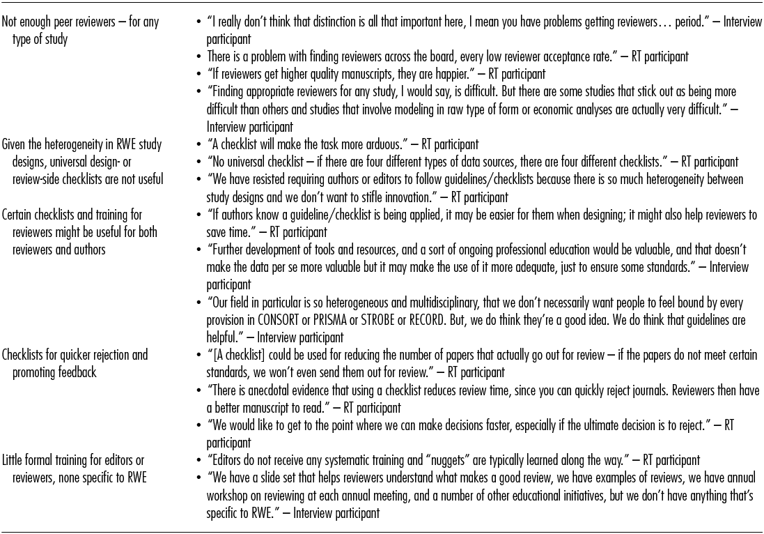 Interviewed editors reported that manuscript acceptance is, in part, predicated on finding competent reviewers that can recognize high-quality papers. Editors reported difficulty in finding reviewers in general, regardless of study design. These challenges are due to: limited time and availability of peer reviewers, reviewer skills incompatible with the manuscript topic, and competition among journals for good reviewers. During the RT discussion, one editor highlighted the need for RWE manuscript peer reviewers to scrutinize the appropriateness of data sources and be acquainted with the RWD source used. Unfortunately, editors report that searching for identifiable characteristics (e.g., experience with specific data sources) for peer-reviewers using existing editorial systems is not feasible.