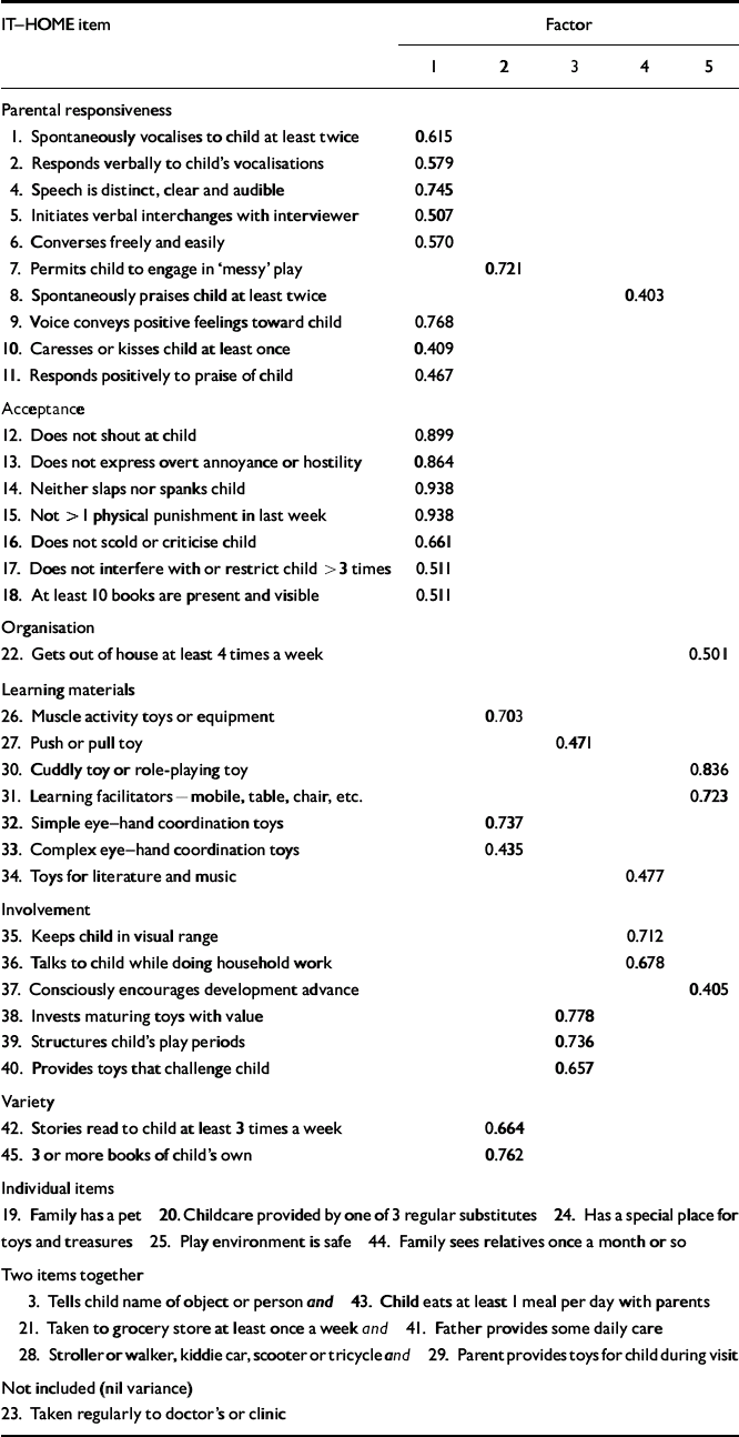 In light of the cautioning by Bradley et al (Reference Bradley, Mundfrom and Whiteside1994) on the use of IT-HOME sub-scale scores with different cultural groups, it seemed appropriate to examine the factor structure of the instrument in this study. Principal components analysis for the pooled sample showed a different factor structure from that of the conventional sub-scales, with 13 factors with eigenvalues greater than 1 being retained. Closest to the original sub-scales was a factor consisting of the majority of items from the responsiveness and acceptance sub-scales. No consistent pattern was apparent for the remaining factors. Table 3 shows individual item loadings on the first five factors. One item (‘child taken regularly to doctor's or clinic’) had to be excluded owing to zero variance across all four centres. Unfortunately, it was not possible to conduct meaningful principal components analyses separately for each centre, owing to the large number of items with zero variance in one or other centre. In light of these findings, total IT-HOME scores rather than sub-scale scores were used in further analyses.