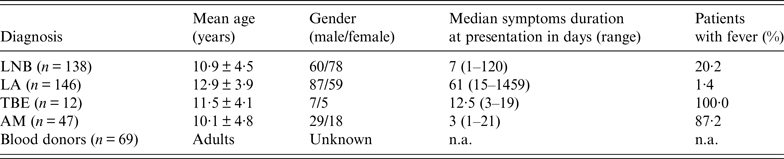 LNB, Lyme neuroborreliosis; LA, Lyme arthritis; TBE, tick-borne encephalitis; AM, aseptic meningitis; n.a., not applicable.