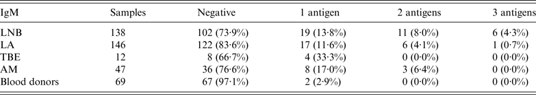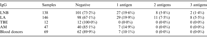 LNB, Lyme neuroborreliosis; LA, Lyme arthritis; TBE, tick-borne encephalitis; AM, aseptic meningitis; Negative, samples with intensity <5·5%.