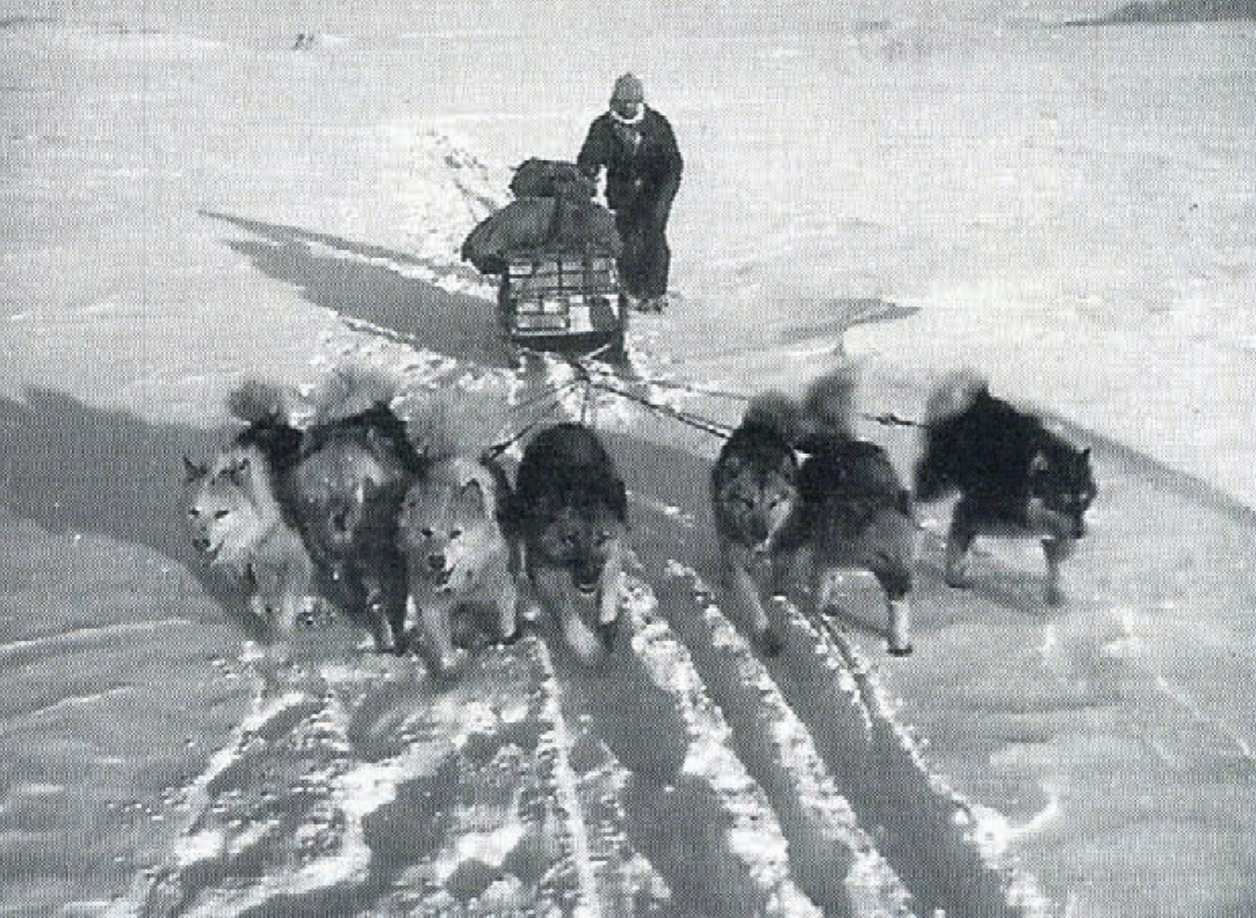 Fig. 5. R. Hamilton driving dog sledge in Ellesmere Island in 1938.