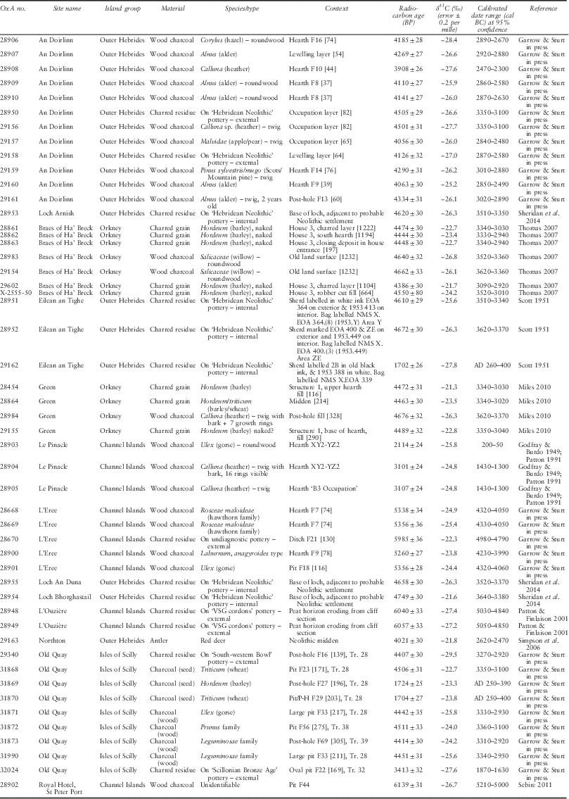 From the numerous sites identified in the database as having potential for further radiocarbon dating, it was necessary to select material with the capacity to provide additional data on the Early Neolithic in the respective regions. Two types of site were defined. Those which appeared likely to fall within the relevant period but remained as yet completely undated, and those which had seen some previous work in terms of radiocarbon dating but which had potential to have sequences refined by additional dates. Appropriate samples for all relevant sites were located where possible and assessed. Additionally, our own recent excavations in Guernsey, the Isles of Scilly, and South Uist produced further suitable samples for dating. In 2013, we made a successful application to the National Environment Research Council radiocarbon facility (NRCF) for funding enabling us to obtain 40 new dates; in 2014, following a second season of work at Old Quay, St Martin’s, we were successful in obtaining 10 additional NRCF-funded dates for that site. The method of sample selection described in Gathering Time (Whittle et al. Reference Whittle, Bayliss and Healy2011, 38–42) was followed as a guideline for procedures throughout.