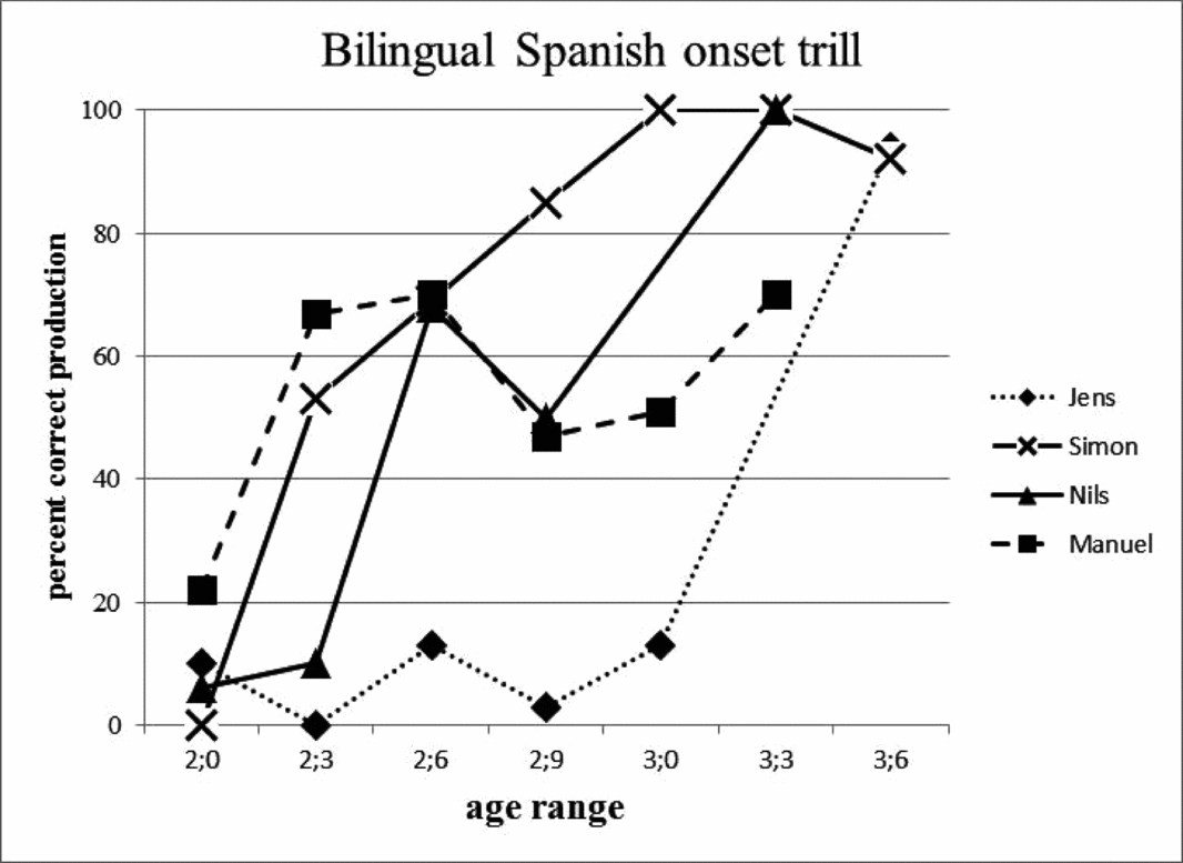 Finally, studying asymmetries between /r/ and /l/ may enrich our understanding of differences between monolingual and bilingual speech with respect to /r/. Kehoe, Hilaire-Debove, Demuth and Lleó (Reference Kehoe, Hilaire, Demuth and Lleó2008) observed that Spanish-speaking children acquired /l/ before /r/ complex onsets. We are interested in knowing whether the same asymmetry between /l/ and /r/ complex onsets exists in the bilingual German and Spanish data.