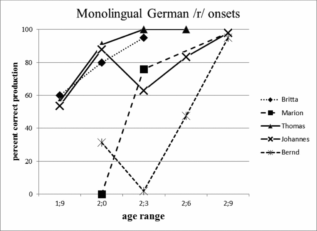 Figure 2. Percent correct production of /r/ in simple onsets (before stressed syllables) in five monolingual German-speaking children across the time period 1;9 to 2;9.