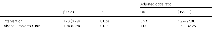 | Alcohol Problems Clinic | 1.94 (0.78) | 0.013 | 7.00 | 1.52-32.25 |