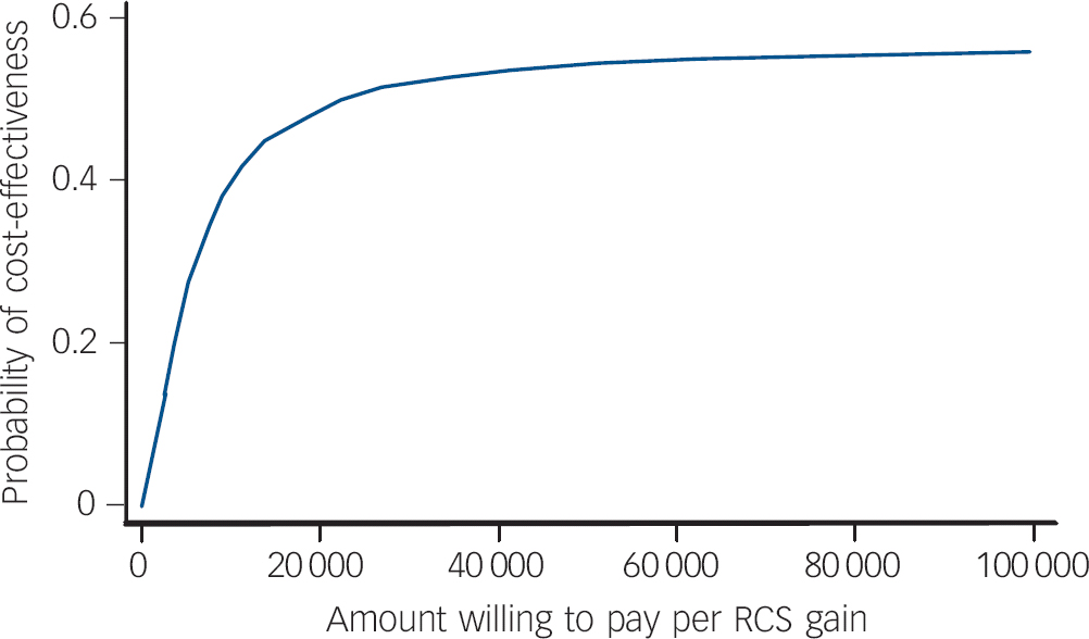 A probability sensitivity analysis (PSA) was undertaken to examine the uncertainty surrounding the cost-effectiveness ratios. Estimates of QALY gains and cost per patient were bootstrapped with 10 000 replications and presented as cost-effectiveness acceptability curves (CEACs) which showed the probability of IAPT being cost-effective at different costs per QALY. This was done for the SF-6D and RCS analysis as well as for the EQ-5D Reference Brooks19 estimates discussed below.