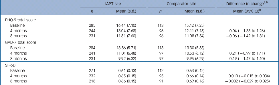Table 1 Patient-reported outcomes at baseline, 4 and 8 months and comparison of changes for Improving Access to Psychological Therapies (IAPT) and comparator sites