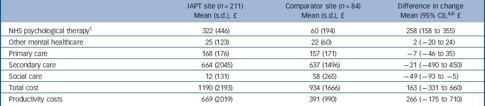 Use of non-IAPT health and social care services was valued using published national unit cost data Reference Curtis15 and NHS reference costs 16 as well as from evaluations. Reference Munro, Nicholl, O'Cathain, Knowles and Morgan17 All health and social care services at the comparator sites were also valued using national unit costs.