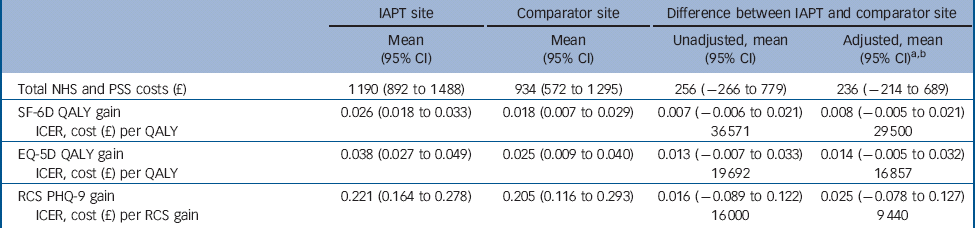 When national unit costs were used in place of IAPT costs, the mean total NHS and PSS cost per patient was £1042 (95% CI 749–1334) in IAPT. This represented an incremental cost of £95 (95% CI −422 to 612), resulting in an ICER of £11 875 per QALY using SF-6D QALY gains and £3800 per participant achieving RCS improvement.