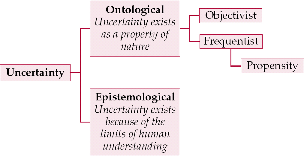 Modern and postmodern models of the world fall into broadly two camps in describing uncertainty (Fig. 1). The first of these, the objectivist position, assumes that randomness exists in nature – that God plays dice. Statistical methods model this uncertainty. The view is often attributed to Laplace. Here, the probability of an event in a particular random trial is defined as the number of equally likely outcomes that lead to that event divided by the total number of equally likely outcomes. Bernoulli's law of large numbers states that if an event occurs a particular set of times k in n independent trials, then if n is arbitrarily large, k/n should be close to the objective probability of the event. However, there are objections to this definition (first raised by Leibniz), not least that objective probability is the probability deduced after an infinitely large number of trials – an abstraction and so not an objective property of the world.