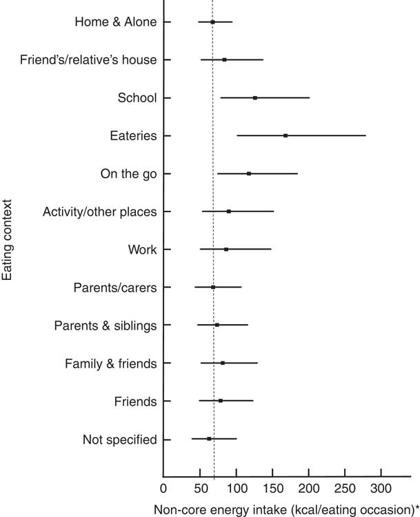 Fig. 1 Associations of eating contexts with non-core energy intake among adolescents (n 884) aged 11–18 years, UK National Diet and Nutrition Survey (NDNS) 2008–2012. *Predicted estimates come from Model 3, adjusted for time of day, day of the week, sex, age, BMI, energy intake and socio-economic status. Computed from Table 5 (estimate=intercept ×ratio), they show non-core energy (in kcal/eating occasion; 1 kcal=4·184 kJ) that adolescents consume in all eating contexts, with 95 % CI represented by horizontal bars. - - - - - shows non-core energy intake at ‘Home’ and ‘Alone’ (intercept), adjusted for factors in Model 3 (mentioned above)