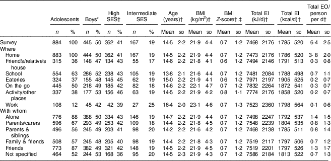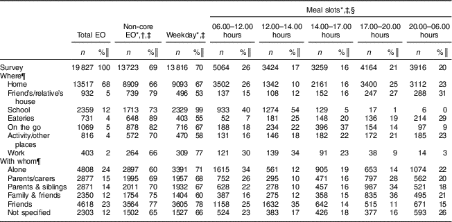 The frequency and percentage of all EO and characteristics of EO in specific ‘where’ and ‘with whom’ eating contexts are reported at the survey level. Total and non-core EO per day consumed by adolescents overall and in specific contexts are described using means and standard deviations. Individual characteristics of adolescents reporting EO overall and in specific contexts are described using frequencies and percentages (for categorical variables) and means and standard deviations (for continuous variables). Pearson χ 2 tests were used to examine simple associations between eating contexts and categorical characteristics of EO or adolescents. Differences between eating contexts and continuous variables were examined using Kruskal–Wallis tests for non-normal and ANOVA for normally distributed variables.