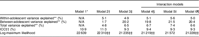 For each model, we calculated the change in the proportion of variance explained in the outcome within adolescents, between adolescents and in total compared with the variance estimated by Model 1. For Models 1–3, the intraclass correlation (between-adolescent variance/total variance) represented the proportion of variance in non-core EI attributable to differences between adolescents. Model fit was assessed using a likelihood ratio test.