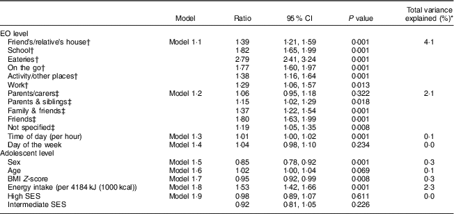 A series of models were run: Model 1 was the null intercept model, which included just the adolescent identifier in the random part of the model, to explore the extent to which differences in non-core EI were bigger between adolescents v. within adolescents. Models 1·1 to 1·9 are random-intercept univariable models, where each model included the adolescent identifier and an additional single explanatory variable from either the EO or adolescent level entered separately in their own model. These models examined the individual effect of each EO-related variable on non-core energy. Model 2 is a random-intercept model and included all explanatory variables at the EO level from Models 1·1 to 1·4 simultaneously to explore the independent effect of each eating context on non-core energy consumption, accounting for time of day and day of the week. Model 3 was Model 2 plus all adolescent-related variables from Models 1·5–1·9 to explore the independent effect of each eating context on non-core energy consumption accounting for time of day, day of the week and between-adolescent differences (i.e. sex, age, SES, EI and BMI). Coefficients from Model 3 were also converted to non-core energy by multiplying the adjusted ratios by the intercept of the model, to provide meaningful units for public health nutrition. The description and purpose of all different models are illustrated in the online supplementary material, Supplemental Table 1.