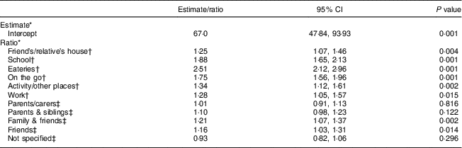 After adjusting for EO and adolescent characteristics (Model 3), evidence for higher non-core EI in all out-of-home locations was robust (Table 5). The effect size of all locations on non-core EI was broadly similar in Model 3 compared with the unadjusted Model 1·1 (Table 4). After these adjustments, ‘Eateries’ remained associated with the highest non-core EI (2·51; 95 % CI 2·12, 2·96), followed by ‘School’ (1·88; 95 % CI 1·65, 2·13).