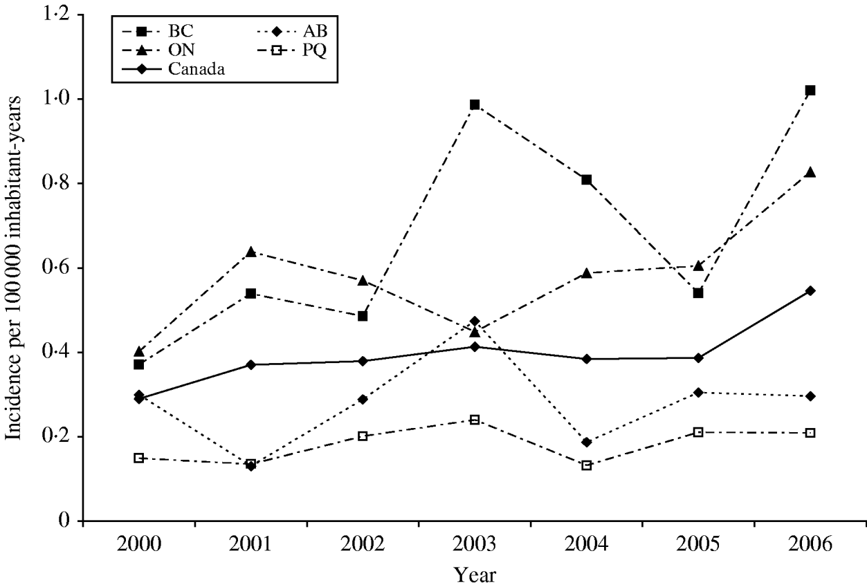 Fig. 1. Incidence rates of S. Typhi in Canada and in the four most populated provinces, 2000–2006. Province identification codes: BC, British Columbia; AB, Alberta; ON, Ontario; PQ, Québec.