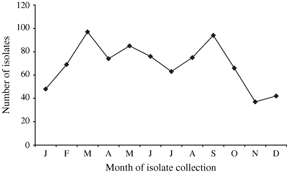 A total of 880 laboratory-confirmed S. Typhi isolations were reported in Canada from 2000 to 2006, with a total number of isolates increasing from 1% (89/6297) to 3% (178/5870) of all Salmonella reported. The isolation rate also increased from 0·29 in 2000 to 0·55 isolations/100 000 inhabitants in 2006 (Fig. 1). The number of S. Typhi cases per region varied from no cases in the northern territories to a total of 501 in the province of Ontario over the 7-year period. British Columbia had the highest isolation rate of S. Typhi, as well as the greatest increase in rates between 2000 (0·37/100 000 inhabitants) and 2006 (1·02/100 000 inhabitants), followed by Ontario, Alberta, and Québec (Fig. 1). The number of isolates identified peaked during the months of March and September (Fig. 2) with the lowest during November. There was a significant seasonal variation in the isolation of S. Typhi (χ2=23·50, d.f.=3, P<0·0001), with 31% of the isolates identified during spring and 26% in summer, followed by 24% in autumn and 19% in the winter.