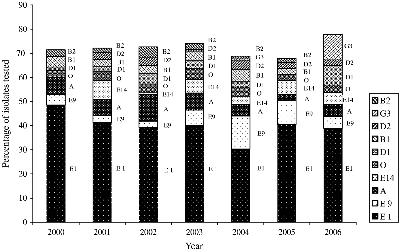 Thirty-nine phage types were identified in the 826 S. Typhi isolates analysed during 2000–2006. There were 134 phage type (PT) Untypable strains that included 65 Untypable Vi Negative, 45 Untypable Vi Positive and 24 Degraded Vi Positive strains (Table 2). The most common phage type identified was PT E1 comprising 39% (n=324) of the isolates tested (Table 2). PT E9 ranked a distant second, accounting for 7% (n=54) followed by PT A (6%, n=51), PT E14 (4%, n=35) and PT O (4%, n=29). PT M1, an epidemic phage type in South and Central Asia [Reference Rowe, Ward and Threllfall9, Reference Hampton12], ranked 11th representing only 2% (n=15) of the S. Typhi strains tested. The proportion of isolates identified as PT E1 decreased from 49% (34/70) of isolates in 2000 to 39% (63/162) in 2006 (Fig. 6). PT E9 increased from 4% (3/70) in 2000 to 14% (17/125) in 2004, and then decreased to 5% (8/162) in 2006. PT A also decreased from 7% (5/70) in 2000 to 5% (8/162) in 2006 (Fig. 6).