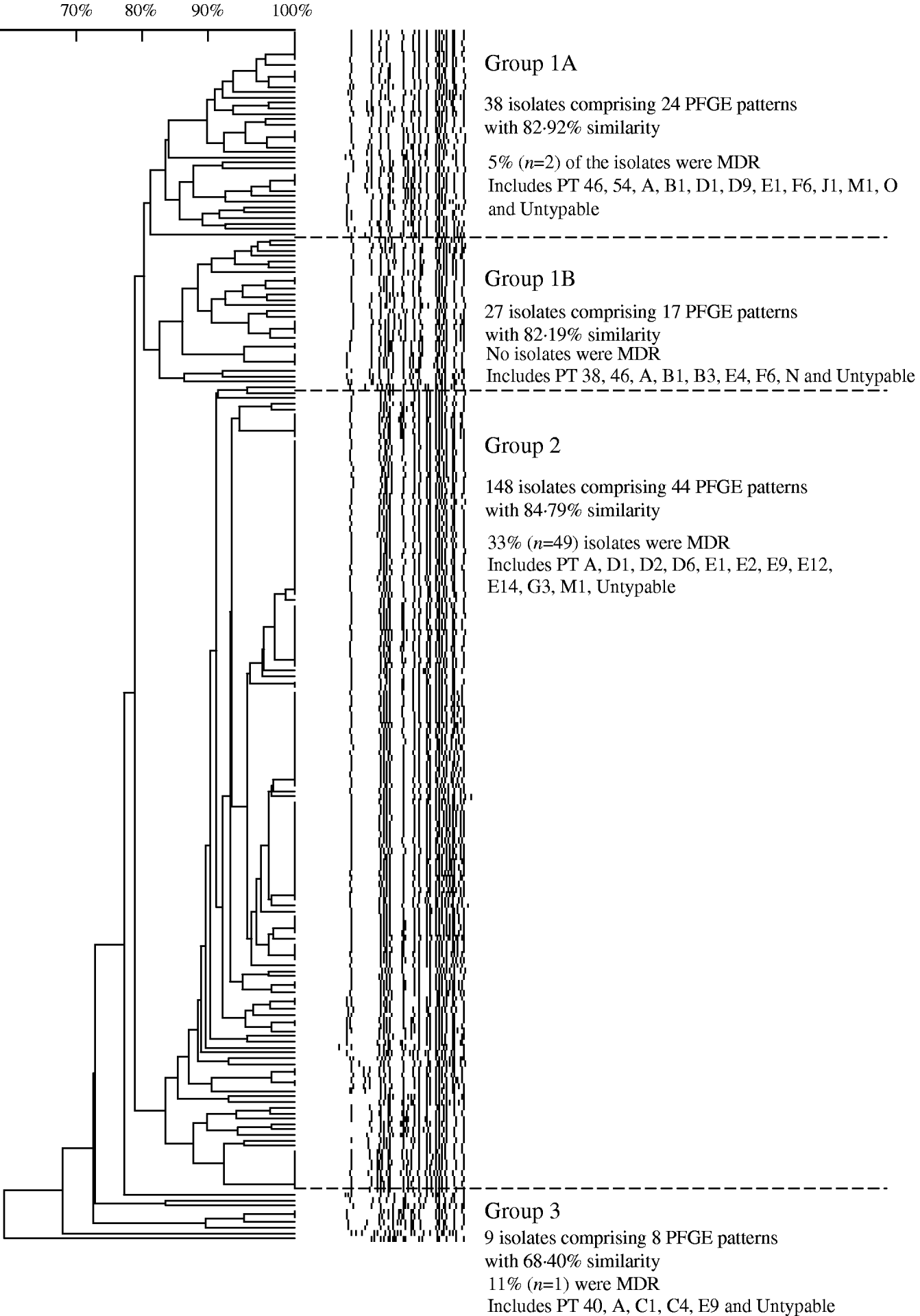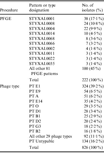 Analysis of 222 isolates by PFGE using enzyme XbaI resulted in 91 distinguishable patterns, demonstrating a moderate level of genetic diversity (Table 2). The five most frequently occurring PFGE patterns accounted for 46% (n=102) of all isolates indicating better discriminatory power than phage typing, wherein the five most frequently occurring phage types identified during 2000 to 2006 comprised 60% (n=493) of all isolates (Table 2). The PFGE patterns had an overall similarity of 66% and clustered into four main groups (Fig. 7). The majority of isolates (67%, n=148) clustered into group 2, the patterns of which showed the highest level of overall similarity (84·79%) compared to the other groups (group 1A, 82·92%; group 1B, 82·19%; group 3, 68·4%). Nearly all isolates in group 3 had unique PFGE patterns (Fig. 7).