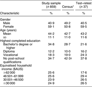 Table 1 shows the participants’ sociodemographic characteristics. More than 50 % of participants were female and the mean age was 44·2 years. Compared with the Brisbane population(33) the study sample slightly over-represented female, older and more educated groups. Participants in the test–retest reliability study had gender proportions similar to those of the main study. However, they were slightly younger (mean age of 43·2 years), with fewer participants from the highest educated and household income groups.