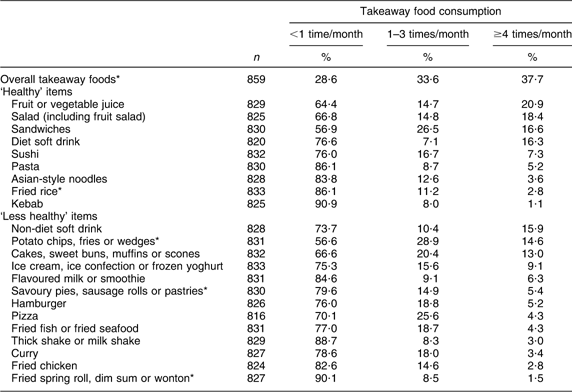 Over one-third (37·7 %) of participants reported consuming takeaway foods ≥4 times/month (Fig. 1, Table 2). Among the twenty-two takeaway items, salads (18·4 %) and fruit or vegetable juices (20·9 %) were the most frequently consumed ‘healthy’ takeaway items. Potato chips, fries or wedges (14·6 %) and non-diet soft drinks (15·9 %) were the most frequently consumed ‘less healthy’ takeaway items.