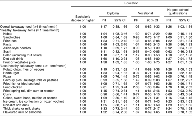 The least educated group was significantly more likely to have reported consuming overall takeaway foods ≥4 times/month compared with their highly educated counterparts (Table 3). For the individual takeaway items, participants with no post-school and vocational qualifications were less likely to consume sushi and more likely to consume fruit or vegetable juice compared with those having a Bachelor's degree or higher. Participants with diploma qualifications were more likely to consume kebabs, pasta, diet soft drinks and fruit or vegetable juice compared with those having a Bachelor's degree or higher. In contrast, most ‘less healthy’ takeaway foods were more likely to be consumed ≥1 time/month by lower educated groups, although the higher prevalence often did not reach statistical significance. Participants with no post-school qualifications were significantly more likely to consume potato chips, fries or wedges; savoury pies, sausage rolls or pastries; fried chicken; and non-diet soft drinks; they were also less likely to consume curry ≥1 time/month compared with those having a Bachelor's degree or higher. Participants with vocational and diploma qualifications were also more likely to consume fried chicken compared with those having a Bachelor's degree or higher.
