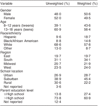 Table 1 summarizes the demographics of the study population. Unweighted and weighted percentages are shown for age, gender, race/ethnicity, parental education, urbanicity and region.