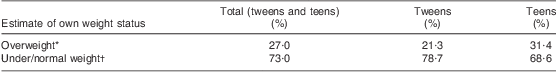 Table 2 shows data on children's self-assessment of their own weight status. When asked to categorize themselves, 27·0 % of children (21·3 % of tweens and 31·4 % of teens) reported being overweight. This compares with a national rate of 34·7 % of 6–19-year-olds with BMI at or above the 85th percentile, based on the most recent National Health and Nutrition Examination Survey (NHANES) data( Reference Ogden, Carroll and Kit 2 ).