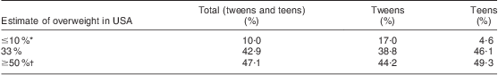 Table 3 Children's estimation of the national rate of overweight/obesity; US children (n 1224) participating in an online survey, January 2010 Question: ‘How many of the kids in the US are overweight?’
