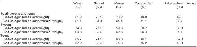 Table 4 shows the responses of children to five separate questions about things that might be worrisome to them, stratified by self-categorized weight status. Among the questions asked, the highest percentage of children who self-categorized as under/normal weight reported worrying about doing well in school (64·4 %) or having enough money (64·4 %). High percentages of children who self-categorized as overweight also worried about school (75·2 %) and money (78·2 %). However, when asked how worried they were about being or becoming overweight there was a large difference between children who self-categorized as overweight and those self-categorized as under/normal weight, with 81·9 % of self-categorized overweight children reporting worrying compared with 31·1 % of self-classified under/normal weight children. Similar trends were found when the responses from tweens and teens were separated. Therefore among the questions asked, weight status was the top worry to children who considered themselves overweight.