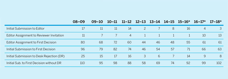 Despite the increasing number of manuscripts our editorial team has to manage, the time until a first decision decreased from 66 days in 2016/2017 to 63 days in 2017/2018. However, if we exclude desk rejections which are processed rather quickly, the time to first decision increases to about 102 days.Footnote 1