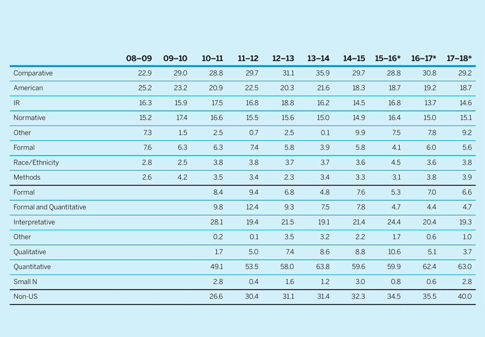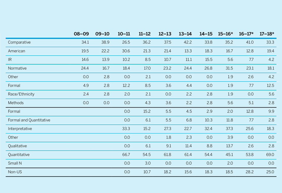 Like in previous terms, the share of submissions is highest from Comparative Politics, followed by American Politics, Normative Political Theory, and International Relations. The first section of table 3 shows the pattern of submissions by subfield over time. Overall, the distribution of submissions across subfields remained stable. The (relatively) biggest changes we see are in the Comparative and American Politics submissions, both slightly decreased to 29% and 19% respectively, while International Relations increased to 14.6%. Submissions in Normative Political Theory and Methods submissions remained stable, but slightly increased to about 15.1% and 3.9% respectively.